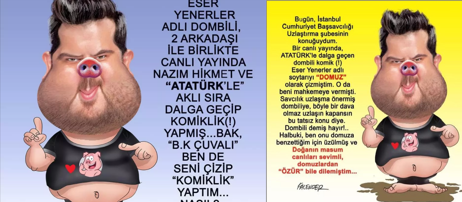Kendisi hakkında çizdiği çirkin karikatürler nedeniyle Öznur Kalender’e dava açan Eser Yenenler açtığı 30 bin TL’lik manevi tazminat davasını kazandı. Kendisini domuza benzeterek dombili, bok, pig, pislik, yağ tulumu gibi ifadeler kullanan karikatürist Öznur Kalender hakkında suç duyurusunda bulundu.Eser Yenenler'in avukatı Orhan Adagül, "Burada eleştirel mizahtan daha çok ağır bir sövgü bulunmaktadır" ifadelerini kullandı..jpg)