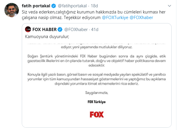 "FOX’un en önemli değerlerinden biri olmuştur." ifadesinin kullanıldığı açıklamayı sosyal paylaşım platformu Twitter hesabı üzerinden açıklama yapan Fatih Portakal, şu ifadeleri kullandı: "Siz veda ederken, çalıştığınız kurumun hakkınızda bu cümleleri kurması her çalışana nasip olmaz. Teşekkür ediyorum @FOXTurkiye @FOXhaber"