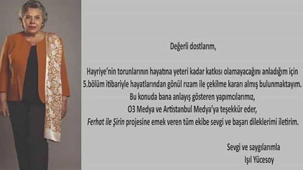 Işıl Yücesoy mesajında “Hayriye2nin torunlarının hayatına yeteri kadar katkısı olamayacağını anladığım için 5. Bölüm itibariyle hayatlarından gönül rızam ile çekilme kararı almış bulunmaktayım. Bu konuda bana anlayış gösteren O3 Medya ve Artistanbul Medya’ya teşekkür ederim. Ferhat ile Şirin projesine emek veren tüm ekibe sevgi ve başarı dilleklerimi iletirim” ifadelerini kullandı. Böylece dizide ilk yaprak dökümü5. Bölümle birlikte yaşanmış oldu.