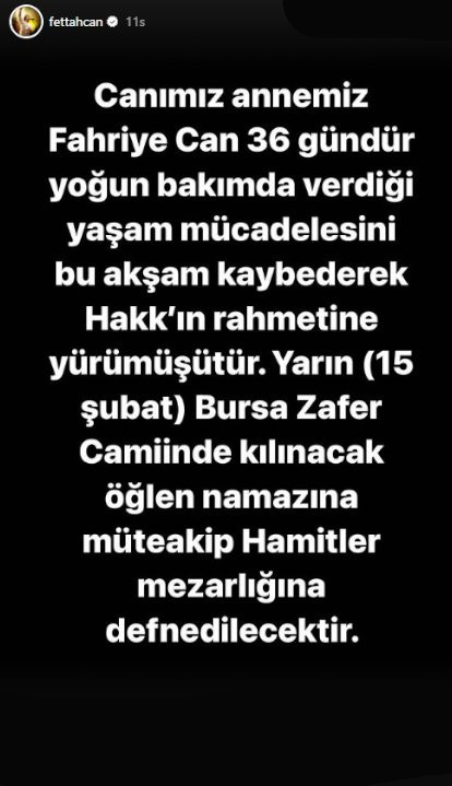 Ünlü şarkıcı Fettah Can bugün hayatının en acı günlerinden biriyle karşı karşıya kaldı. Pek çok şarkısıyla dillerde olan ve özellikle genç kitlenin çok sevdiği şarkıcılardan biri olan Fettah Can bugün sosyal medya hesabından yaptığı paylaşımla annesini kaybettiğini duyurdu. Ünlü şarkıcı paylaşımında “canımız annemiz Fahriye Can, 36 günlük yoğun bakımda verdiği yaşam mücadelesini kaybederek Hakk’ın rahmetine yürümüştür. Bugün Bursa Zafer Camii’nde kılınacak öğlen namazını müteakip, Hamitler mezarlığına defnedilecektir” ifadelerini kullandı. Ünlü ismin bu paylaşımının ardından pek çok seveni ünlü isme taziye mesajlarını iletti. Fettah Can annesini öğlen namazını müteakip kılınan cenaze namazının ardından toprağa verdi. Ünlü ismin tören sırasında oldukça üzgün olduğu görüldü.