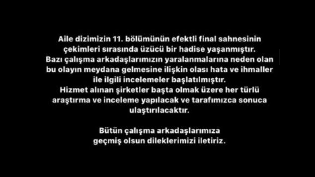 Show Tv ekranlarında yayınlanan ve Salı akşamları seyirciyle buluşan Ay Yapım imzalı Aile dizisinin setinden üzücü bir haber geldi. Halen 11. Bölüm çekimleri devam eden ve aldığı reytinglerle Salı akşamlarının en çok izlenen yapımları arasında yer alan dizinin çekimleri sırasında istenmeyen bir kaza yaşandığı ve kaza sırasında set çalışanlarının bazılarının yaralandığı ve hastaneye kaldırıldığı öğrenildi. İnternet haber sitelerinde ve magazin basınında yer alan haber bir anda gündemin ilk sıralarına otururken dizinin yapım şirketi Ay Yapım ise sosyal medya hesabından kazaya ilişkin bir açıklama yayınladı ve olayın her yönüyle araştırıldığını ve incelemelerin başlatıldığını duyurdu. Kazaya ilişkin detaylı bir bilgi edinilemezken kazanın çekimleri devam eden 11. Bölümün final sahnesinde yaşandığı öğrenildi.