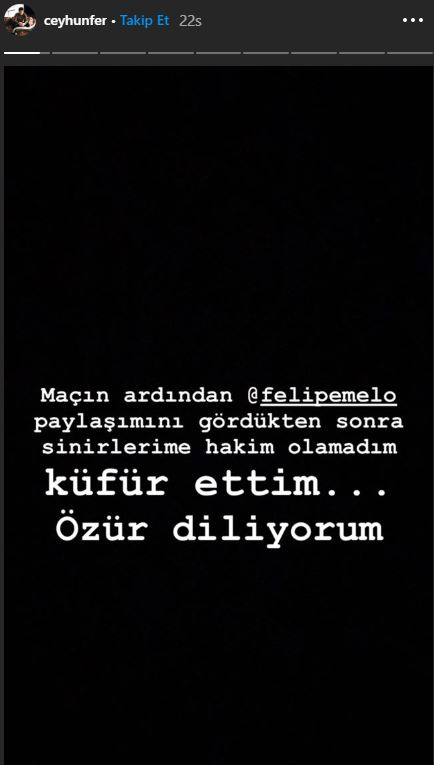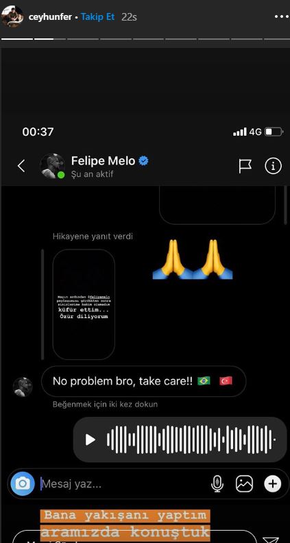 Oyuncu Ceyhun Fersoy daha sonra hikayesinde Felibe Melo ile özel mesajlaşmlarını paylaştı. Özrünü kabul ettiği anlaşılana eski Galatasaray futbolcusu Melo, Fersoy'a "No problem Bro, Take Care" mesajını paylaştı. Sesli bir mesajlaşmanın da yaşandığı görülen yazışmaları Fersoy, hikayesinde paylaştı ve "Bana yakışanı yaptım aramızda konuştuk" notuyla takipçilerine göstermiş oldu. Bir anlık sinirle yaptığı hatadan dönen Ceyhun Fersoy, Melo'dan özür diledi ve mesajlardan anlaşılacağı üzere problem çözülmüş oldu.