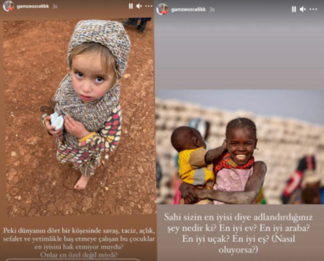 Şeyma Subaşı'nın paylaşımının ardından gönderme yaparak paylaşım yapan Gamze Özçelik, 'Peki dünyanın dört bir köşesinde savaş, taciz, açlık, sefalet ve yetimlikle baş etmeye çalışan bu çocuklar en iyisini hak etmiyor muydu? Onlar en özel değil miydi? sözlerini kullandı.