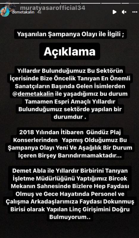 Sahnedeki görüntüler nedeniyle Demet Akalın'a tepkiler çığ gibi büyürken o garsondan açıklama geldi. Demet Akalın'ın da kendi hesabından paylaştığı açıklamada garson Murat Yaşar şu ifadeleri kullandı; "Yıllardır bulunduğumuz bu sektörün içerisinde bize öncelik tanıyan en önemli sanatçıların başında gelen isimlerden Demet Akalın ile yaşadığımız bu durum tamamen espri amaçlı yıllardır bulunduğumuz sektörde yapılan bir durumdur. 2018 yılından itibaren gündüz plaj konserlerinden yapmış olduğumuz bu şampanya olayı yeni ve aşağılık bir durum içeren bir şey barındırmamaktadır. Demet Abla ile yıllardır birbirini tanıyan işletme müdürlüğünü yaptığımız, birçok mekanın sahnesinde bizlere hep faydası olmuş ve gece hayatında personel ve çalışma arkadaşlarımıza faydası dokunmuş birisi olarak yapılan linç girişimini doğru bulmuyorum."
