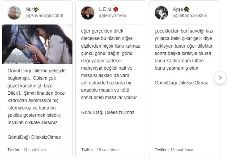 Gönül Dağı dizisinden Dilek karakterinin ayrılmaması için sosyal medyada kampanya başlatan hayranları, #GönülDağı Dileksizolmaz etiketi ile Twitter gündem oldu.