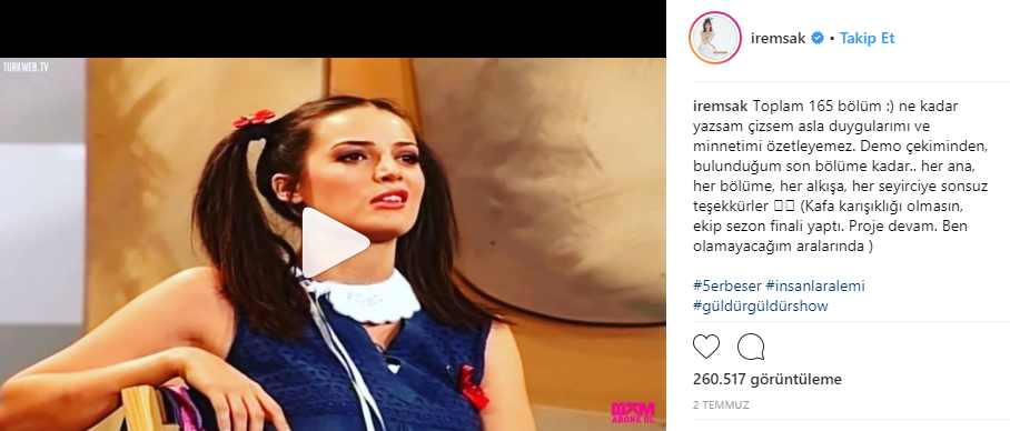 Ali Sunal'ın sunumuyla Show TV ekranlarında yayınlanan Güldür Güldür Show'da gelecek İrem Sak yer almayacak. 165 bölümdür programda yer alan İrem Sak, gelecek sezon projede yer almayacağını sosyal medya hesabından duyurdu. İrem Sak'ın paylaşımı yüzbinlerce kişi tarafından görülürken, izleyiciler yorumlarda üzüntülerini dile getirdiler;