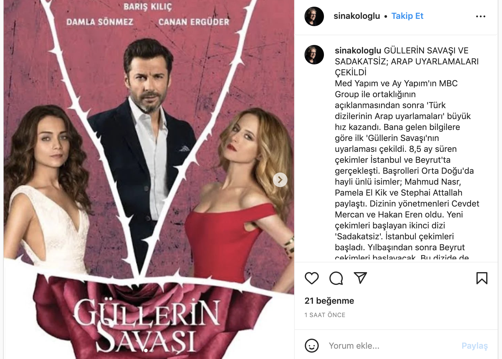 Yazar Sina Koloğlu, Instagram hesabından yaptığı paylaşımda Türk dizileriyle ilgili gelişmeyi şu cümlelerle duyurdu: "Med Yapım ve Ay Yapım'ın MBC Group ile ortaklığının açıklanmasından sonra 'Türk dizilerinin Arap uyarlamaları' büyük hız kazandı. Bana gelen bilgilere göre ilk 'Güllerin Savaşı'nın uyarlaması çekildi. 8,5 ay süren çekimler İstanbul ve Beyrut'ta gerçekleşti. Başrolleri Orta Doğu'da hayli ünlü isimler; Mahmud Nasr, Pamela El Kik ve Stephai Attallah paylaştı. Dizinin yönetmenleri Cevdet Mercan ve Hakan Eren oldu. Yeni çekimleri başlayan ikinci dizi 'Sadakatsiz'. İstanbul çekimleri başladı. Yılbaşından sonra Beyrut çekimleri başlayacak. Bu dizide de bölgenin önemli oyuncuları başrollerde; Sulafa Mimar, Qays Sheikh Najib, Maram Ali. Dizinin yönetmeni Ender Emir."