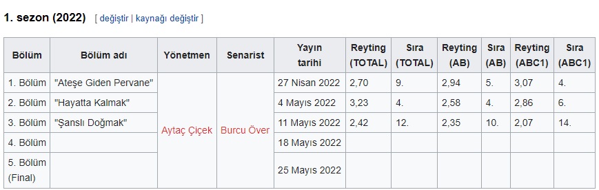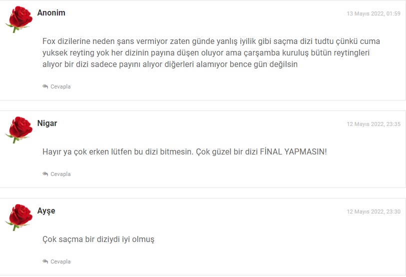 Başladığı günden bu yana yalnızca 3 bölüm ekranlara gelen dizi bir türlü reytinglerde yükseliş sağlayamadı ve reytinglerin düşük olması sebebi ile, kanal yönetimi tarafından erken final kararı alınmasına neden oldu. Total reyting grubu başta olmak üzere Reyting derecesi 3 ün altında kaldığı için AB ve ABC1’de beklediği başarıyı bir türlü gösteremedi.