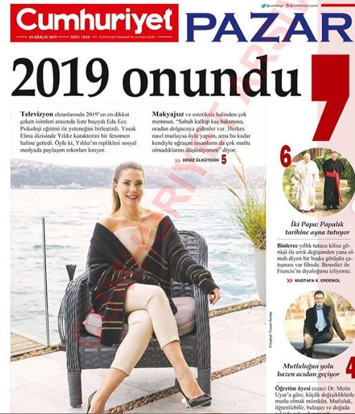 Yıldızı parlayan Eda Ece, Fox Tv'de yayınlanan Yasak Elma dizisinde Yıldız karakteriyle oldukça başarılı bir oyunculuk performansı sergiliyor. Üç sezondur Yasak Elma'da yer alan Ece'nin başarısı ve performansı herkes tarafından takdir edilirken, güzel yıldız dikkatleri üzerine çekmeyi başarıyor. Sosyal medya hesaplarını da etkili bir şekilde kullanan Ece, geçen günlerde Cumhuriyet Pazar ekinde de kapak konusu olmuş ve gazetede "2019 Onundu" başlığıyla yer almıştı. Kariyerinin en parlak günlerini yaşayan Ece bir yandan Yasak Elma'daki çalışmalarına devam ederken diğer yandan magazin basınının gözdelerinden biri olmayı başardı. Yasak Elma'da zengin olma hırsıyla yapamayacağı şey olmayan güzel ve güçlü bir kadın Yıldız karakterini canlandıran Eda Ece, son günlerin en dikkat çeken isimleri arasında.