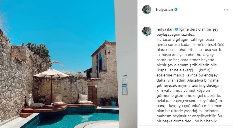 Hülya Aslan İnstagram hesabından gittiği otellerde yaşadığı sorunları ve en son Alaçatı'da karşılaştığı tacizi paylaştı. Aslan paylaşımında, "Haftasonu gittiğim tatil için orası neresi sorusu kadar, izmir'de tesettürlü olarak nasıl rahat ettiniz sorusu vardı, ilk başta anlayamadım bu kaygıyı sonra ise beş para etmez hayatta hiçbir şey olamamış zibidilerin bile "kapalılar ne alakağğ .... (küfür)" sözlerine maruz kalınca bu endişeyi daha iyi anladım" ifadelerini kullanmıştı. Daha sonra Günaydın gazetesine de konuşan Aslan, "Alaçatı’da yaşadığım olayla ilgili paylaşımımın altına binlerce yorum geldi. Aynı şeyi yaşayan binlerce kadına farklı şekillerde travma yaşatılmış. Çünkü tatile gidiyorsunuz; saçma sapan bakışlarla ve tavırlarla karşılaşıyorsunuz. Otelde ‘Siz başörtülüsünüz burada rahat edemezsiniz’ diyorlar. Bu iş zorbalığa dönüşmeye başladı" dedi.