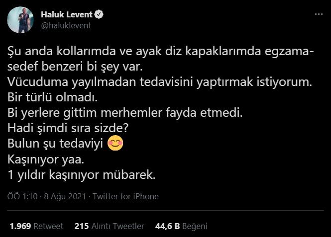 'Şu anda kollarımda ve ayak diz kapaklarımda egzama-sedef benzeri bi şey var. Vücuduma yayılmadan tedavisini yaptırmak istiyorum. Bir türlü olmadı. Bi yerlere gittim merhemler fayda etmedi. Hadi şimdi sıra sizde? Bulun şu tedaviyi. Kaşınıyor yaa. 1 yıldır kaşınıyor mübarek.' sözleri ile paylaşım yapan Haluk Levent, yaşadığı sağlık problemi için yardım istedi.