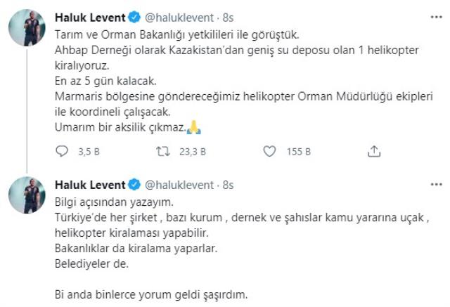 Ülkenin bir çok yerinde devam eden orman yangınlarını söndürme çalışmalarında yer alan ünlü şarkıcı Haluk Levent, helikopter müjdesini verdi. Orman yangınlarında mağdur olan köy halkının yanında olan ve her türlü yardımı ileten Haluk Levent, sosyal medya hesabından, 'Tarım ve Orman Bakanlığı yetkilileri ile görüştük. Ahbap Derneği olarak Kazakistan'dan geniş su deposu olan 1 helikopter kiralıyoruz. En az 5 gün kalacak. Marmaris bölgesine göndereceğimiz helikopter Orman Müdürlüğü ekipleri ile koordineli çalışacak. Umarım bir aksilik çıkmaz' sözlerini kullandı.