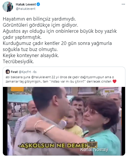 İhtiyaç sahiplerine yaptığı yardımlarla gündem oluşturan Haluk Levent'in yaptığı yardımdan dolayı duyduğu pişmanlığı itiraf etmesi de garip bir ironi olarak sosyal medyayı etkiledi. Twitter'da bir hayranı ünlü sanatçının 1999 depreminde afetzedelere çadır dağıttığı görüntüleri 'Haluk Levent 22 yıl önce de çadır dağıtıyormuş' notuyla paylaştı. Hayranının paylaşımını kendi hesabından yüksünmeden paylaşan Haluk Levent itirafını şu cümlelerle dile getirdi: 'Hayatımın en bilinçsiz yardımıydı. Görüntüleri gördükçe içim gidiyor. Ağustos ayı olduğu için on binlerce büyük boy yazlık çadır yaptırmıştık. Kurduğumuz çadır kentler 20 gün sonra yağmurla soğukla tuz buz olmuştu."