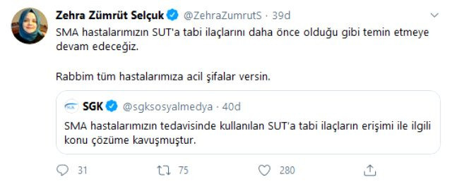 Herkes güzel oyuncunun Sağlık Bakanına gönderdiği videoya Sayın Bakan Fahrettin Koca’nın vereceği merak ediyor. ancak cevap ondan değil bir başka Bakandan, Aile , Çalışma ve Sosyal Hizmetler Bakanı Zehra Zümrüt Selçuk'tan yanıt geldi. Bakan Selçuk, Twitter hesabından yaptığı paylaşımda, SMA hastalarının tedavisinde kullanılan SUT'a tabi ilaçlarının erişimi ile ilgili yaşanan sıkıntıların çözüme kavuştuğunu açıkladı.