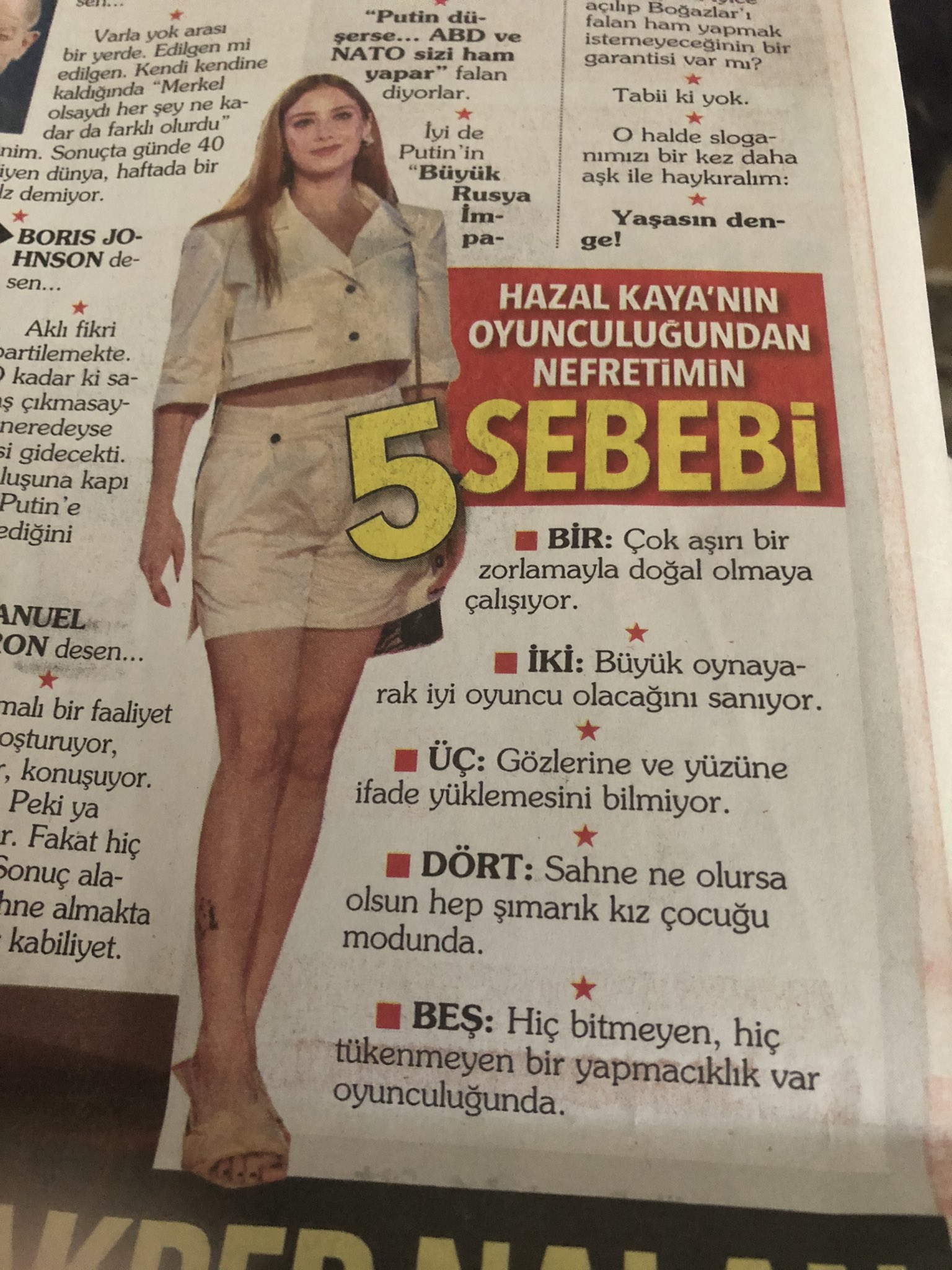 Gazateci Ahmet Hakan'ın bugünkü köşe yazında Hazal Kaya'nın oyunculuğu ile ilgili çok sert eleştiriler yer aldı. Pera Palas'ta Gece Yarısı dizisindeki performansının eleştirildiği yazı başta başlığı olmak üzere birçok noktada eleştiri aldı. Ahmet Hakan'ın 'nefret' kelimesini kullanması da nefret söylemi olarak değerlendirildi. Gün boyunc konuşulan köşe yazısının ardından Hazal Kaya cevap niteliğinde bir açıklama paylaştı.