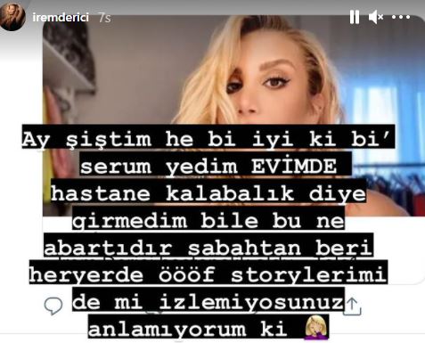 İrem Derici'nin sağlık durumuyla ilgili haberler gün boyuncu magazin sitelerinde yer aldı. Hastanede beklemeyen serumuyla kiraladığı yazlığına dönen Derici bir paylaşım daha yaptı. İrem Derici, "Bir sürü mesaj gelmiş, iyi misin diye. Çok iyiyim. Serumu her ihtimale karşı aldım. Yanlış anlaşılma olmasın. Tam gaz devam konserler" dedi. Derici daha sonra instagram hesabından bir paylaşım daha yaparak yapılan haberlere sert çıktı.. Derici paylaştığı hikayede, "Ay şiştim he iyi ki bi' serum yedim EVİMDE hastane kalabalık diye girmedim bile bu ne abartıdır. Sabahtan beri her yerde. Storylerimi de mi izlemiyorsunuz anlamıyorum ki…" yazdı. Sağlık durumunun iyi olduğunu belirten İrem Derici konserlerine devam edeceğini özellikle belirtti. İrem Derici'nin Bayramın ikinci günü 21 Temmuz'da Afyon'da bir konser programı var. İrem Derici sağlık durumunun iyi olduğunu ve programında aksama olmadığını belirtti.