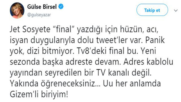 Tv 8’de yayınlanan ve Gülse Birsel'in senaryosunu yazdığı ve başrolünde oynadığı Jet Sosyete dizisi, 2 Mayıs Perşembe akşamı yayınlanan 39. son bölümüyle sezon finali yaptı. TV8 ekranlarına veda eden Jet Sosyete dizisi için Gülse Birsel’den flaş bir açıklama geldi. TV8 ekranlarında ikinci sezonuyla yayınlanan Jet Sosyete dizisi 39. bölümüyle sezon finali yaptı. Şarkıcı Nilüfer’in de konuk oyuncu olarak rol aldığı Jet Sosyete’nin final bölümünde sürprizler yaşandı. Dizinin senaristi ve başrol oyuncularından Gülse Birsel ise final bölümünün yayınlandığı sıralarda sosyal medya hesabından açıklama yaptı. ‘Jet Sosyete bitti mi?’ sorusunu yanıtlayan Birsel, “Jet Sosyete ‘final’ yazdığı için hüzün, acı, isyan duygularıyla dolu tweet'ler var. Panik yok, dizi bitmiyor. Tv8'deki final bu. Yeni sezonda başka adreste devam. Adres kablolu yayından seyredilen bir TV kanalı değil. Yakında öğreneceksiniz” notunu paylaştı. Bu açıklamayla Jet Sosyete için yeni bir serüven başlamış oldu. Seyirci şimdi sevilen ve eğlenceli dizinin hangi kanalda yayınlanacağını merak etmeye başladı.