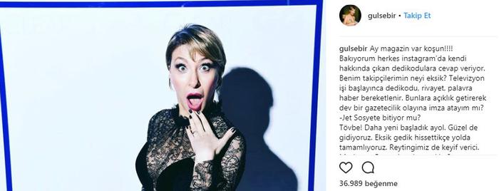 Star Tv 'nin merakla beklenen dizisi Jet Sosyete yayınlandığı ilk bölümüyle büyük ilgi gördü. Fakat sosyal medyada büyük eleştiri haline gelen dizi 2.bölüyle totel grubu reyting lerde resmen çakıldı. Dizi final mi yapıyor sorusuna dizinin seneristi Gülse Birsel ilginç açıklama geldi ve bu söylenenleri ti'ye aldı.Merak edilenleri soru cevap şeklinde cevaplayan Gülse Birsel sosyal medyada takipçilerinden büyük destek aldı.