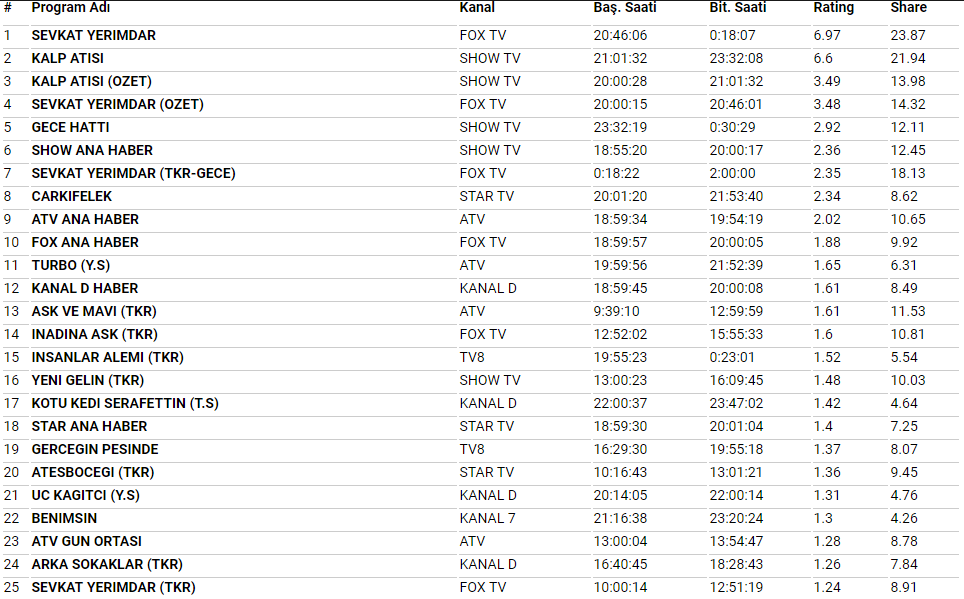 28 Temmuz Cuma günü tarihinde yayınlanan Kalp Atışı ve Şevkat Yerimdar dizilerinin reyting sonuçları açıklandı. Dün akşam yeni bölümü yayınlanan Şevkat Yerimdar, 1. sırada yer alırken, 2. sırada ShowTv ekranlarının dizisi Kalp Atışı yer aldı. Son olarak 3. sırada ise Kalp Atışı dizisinin özet bölümü yer aldı.
