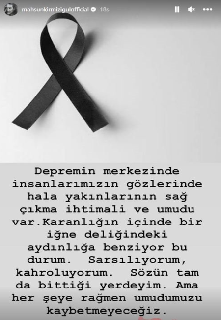 Ünlü isim yaşadıklarını anlatırken yapılan çalışmalara ve yapılması gerekenlere de değindi. Mahsun Kırmızıgül “depremin merkezinde insanlarımızın gözlerinde hala yakınlarının sağ çıkma ihtimali ve umudu var. Karanlığın içinde bir iğne deliğindeki aydınlığa benziyor bu durum. Sarsılıyorum, kahroluyorum. Sözün tam da bittiği yerdeyim. Ama her şeye rağmen umudumuzu kaybetmeyeceğiz. Bir aracın içine her şeyi koymaya çalışmayın. Adıyaman depolama alanlarının birinde görevli arkadaşlarımız zamanla savaşırken buraya gelen malzemeleri ayırmakta zorlanıyor. Acil! Halkın barınma sorunu ile ilgili çözüme acil ihtiyaç var” ifadelerini kullandı. Ünlü isim geçtiğimiz günlerde de vizyona yeni giren Prestij Meselesi adlı filmi yaşanan deprem sonrası vizyondan çekme kararı almıştı.