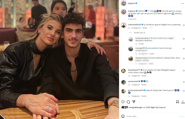 Mehmet Ali Erbil ‘in ve Tuğba Coşkun’un oğlları Ali Sadi 17 yaşına girdi. Tuğba Coşkun oğlu Ali Sadi’nin doğum günü için bir doğum günü mesajı yayınladı. Tuğba Coşkun’un, "Ali'm 17 oldu. Seninle aşkımız sonsuz ve tarifsiz. Seni çok seviyorum iyi ki benim oğlumsun" şeklindeki instagram paylaşımına yorumlar ardı ardına gelmeye başladı. Pek çok takipçileri ve ünlüler de bu paylaşıma duyarsız kalmadı ve yorum yağdırdı. Bu yorumlardan biri de 2005 ile 2011 yılları arasında evli olan ünlü şovmen Mehmet Ali Erbil’den geldi. Müzmin hastalığı ile gündemden düşmeyen ünlü sunucu M. Ali Erbil “İyi ki birlikte en güzel, en değerli birini yaratmışız “ şeklinde Tuğba Coşkun’un sosyal medya paylaşımına yorum yaptı.