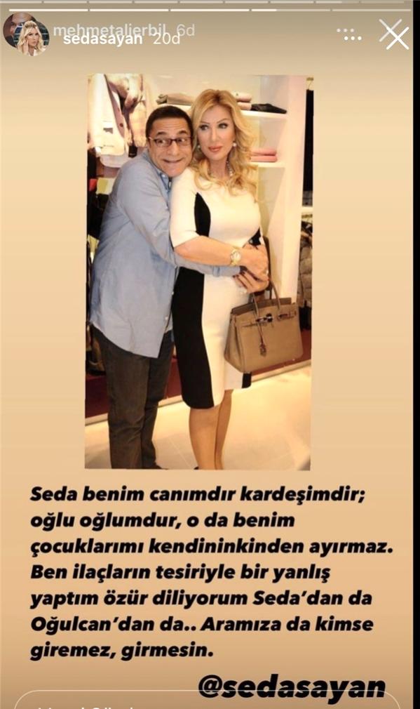Tüm bu sözlere karşılık ünlü şovmen Mehmet Ali Erbil ise, 'Seda benim canımdır, kardeşimdir. Oğlu oğlumdur. O da benim çocuklarımı kendininkinden ayırmaz. Ben ilaçların tesiriyle yanlış yaptım, özür diliyorum Seda'dan da Oğulcan'dan da. Aramıza da kimse giremez, girmesin' diyerek geri adım attı.