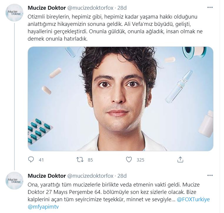 Otizm hastalığına da farkındalık oluşturan Mucize Doktor dizisi finale gidiyor. Mucize Doktor sosyal medya hesabından final tarihi hakkında bir açıklama yapıldı. Açıklamaya göre Mucize Doktor 64. Bölümde final yapacak. Mucize Doktor sosyal medya hesabından oldukça duygusal bir veda mesajı yayınlandı. O mesajda, "Otizmli bireylerin, hepimiz gibi, hepimiz kadar yaşama hakkı olduğunu anlattığımız hikayemizin sonuna geldik. Ali Vefa’mız büyüdü, gelişti, hayallerini gerçekleştirdi. Onunla güldük, onunla ağladık, insan olmak ne demek onunla hatırladık. Ona, yarattığı tüm mucizelerle birlikte veda etmenin vakti geldi. Mucize Doktor 27 Mayıs Perşembe 64. bölümüyle son kez sizlerle olacak. Bize kalplerini açan tüm seyircimize teşekkür, minnet ve sevgiyle…" ifadeleri kullanıldı.