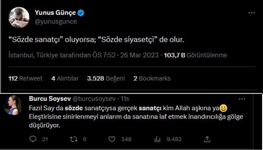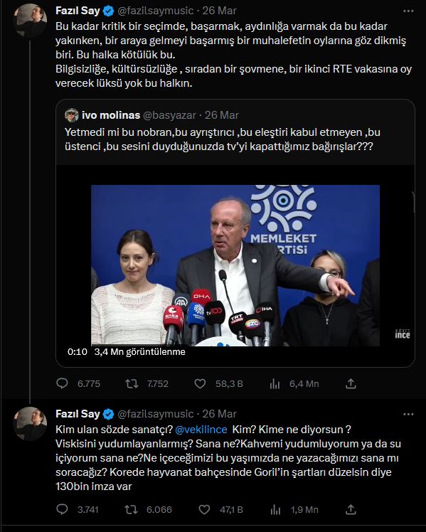 Fazıl Say:"Bu kadar kritik bir seçimde, başarmak, aydınlığa varmak da bu kadar yakınken, bir araya gelmeyi başarmış bir muhalefetin oylarına göz dikmiş biri. Bu halka kötülük bu. Bilgisizliğe, kültürsüzlüğe , sıradan bir şovmene, bir ikinci RTE vakasına oy verecek lüksü yok bu halkın".jpg)