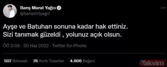 Survivor yarışmacılarından Barış Murat Yağcı’da sosyal medya hesabından Batuhan ve Ayşe’yi kutlayan bir mesaj yayınladı.