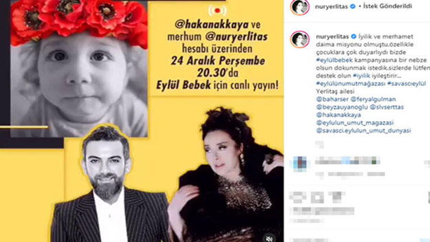 Dün gece gerçekleştirilen yardım kampanyasında ünlü modacı Nur Yerlitaş’ın 100’ün üzerinde eşyası satışa sunulurken ayrıca pek çok ünlü isimde SMA hastası küçük Eylül için yayına katıldı. Seda Sayan, Sibel Can, Melek Baykal gibi ünlü isimler Nur Yerlitaş adına yapılan paylaşıma yorum yaparak katkıda bulundu. Geceye ayrıca Sibel can, Serenay Sarıkaya ve Hande Erçel’in de bazı eşyalarıyla katkıda bulunduğu öğrenildi. Geceye Hande Yener, Gülben Ergen, Hakan Akkaya ve Gonca Vuslateri gibi ünlü isimlerde katıldı.