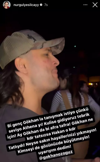 Konserin ardından heyecanla Grubun solisti Gökhan Özoğuz ile tanışmak için kulise gittiklerini belirten Nurgül Yeşilçay Gökhan Özoğuz’un soğuk ve kibirli tavrı ile şok olduklarını belirtti. Gökhan’ın ikizi Hakan’ın kendilerini sıcak bir şekilde karşılayıp ilgilenmesini de göz ardı etmeyen sanatçı Gökhan Özoğuz’u da etiketleyerek sosyal medya hesabından "Bir genç Gökhan'la tanışmak istiyor çünkü seviyor Athena'yı. Kulise gidiyoruz tebrik için. Gökhan'da bir afra tafra! Gökhan ne kadar tatsızsa Hakan o kadar tatlıydı. Neyse sakın hayallerinizi yıkmayın! Kimseyi de gözünüzde büyütmeyin! Uyarayım dedim" şeklinde paylaşım yaptı.