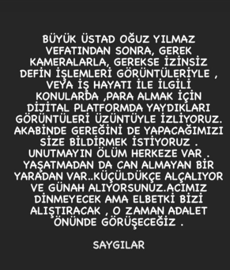 Cenaze ve defin işlemleri sırasında basına yansıyan görüntüler ise acılarını arttırdı. Aileden açıklama geldi; "Büyük üstad Oğuz Yılmaz vefatından sonra gerek kameralarla, gerekse izinsiz defin işlemleri görüntüleriyle veya iş hayatı ile ilgili konularda, para almak için dijital platformda yaydıkları görüntüleri üzüntüyle izliyoruz. Akabinde gereğinin yapılacağını da size bildirmek istiyoruz. Unutmayın ölüm herkese var. Yaşatmayan da can almayan bir yaratan var. Küçüldükçe alçalıyor ve günah alıyorsunuz. Acımız dinmeyecek ama elbette bizi alıştıracak, o zaman adalet önünde görüşeceğiz..."