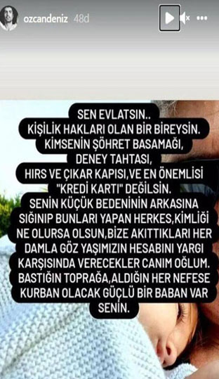 Özcan Deniz de geçen günlerde oğlunun fotoğrafını paylaşarak sosyal medya hesabından oğluna seslenmişti; "Sen evlatsın… Kişilik hakları olan bir bireysin. Kimsenin şöhret basamağı, deney tahtası, hırs ve çıkar kapısı ve en önemlisi kredi kartı değilsin. Senin küçük bedeninin arkasına sığınıp bunları yapan herkes, kimliği ne olursa olsun bize akıttıkları her damla gözyaşımızın hesabını yargı karşısında verecekler canım oğlum. Bastığın toprağa, aldığın nefese kurban olacak güçlü bir baban var senin."