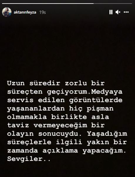 Magazin gündemine bomba gibi düşen Feyza Aktan'ın Özcan Deniz'i darp ettiği görüntüler herkesi şoke etmişti. Özcan Deniz'e tokat atan Feyza Aktan'dan görüntülerle ilgili açıklama geldi. Feyza Aktan sosyal medya hesabından bir paylaşım yaparak görüntüler hakkında açıklama yapacağını belirtti. Özcan Deniz'e yönelik yaptığı hareketten pişman olmadığını ima eden Feyza Aktan asla taviz vermeyeceğini söyledi. Feyza Aktan medyaya yansıyan görüntülerde Özcan Deniz'e önce tokat atıyor ve ardından üzerindeki tişörtünü parçalıyordu.