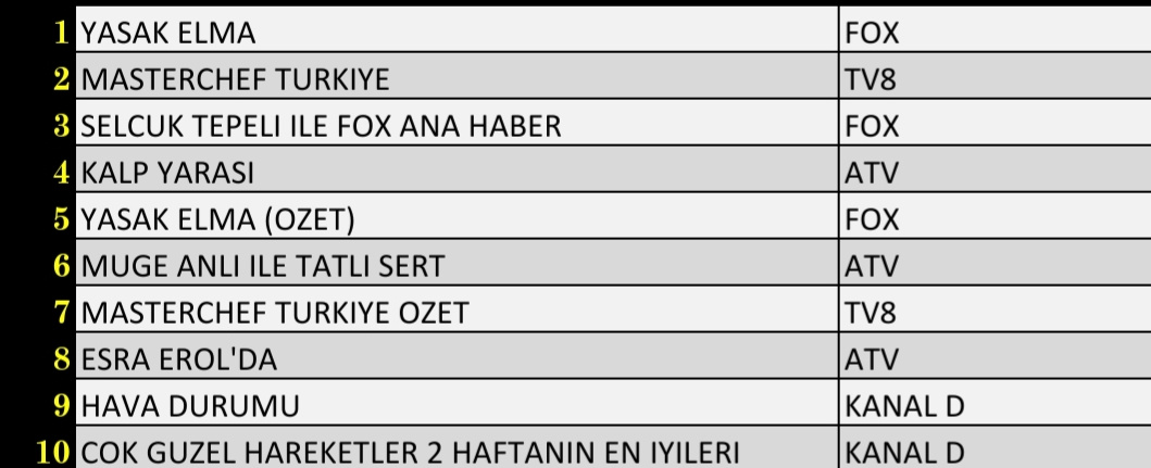 ABC1 reyting grubunda ise durum şöyle; 'Yasak Elma' birinci, 'MasterChef Türkiye'ikinci, 'Kalp Yarası' üçüncü sırada yer alan yapımlar oldu.