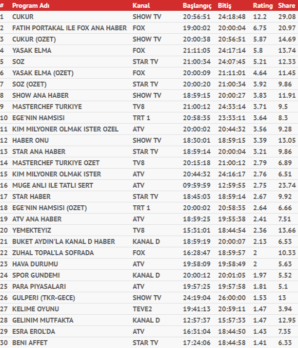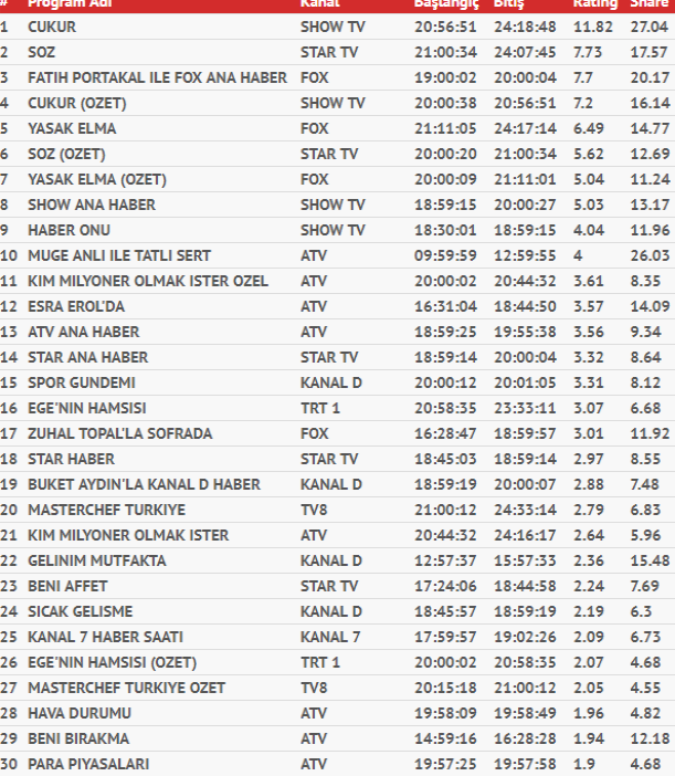 TRT'nin sevilen dizisi Ege'nin Hamsisi dün yayınlanan bölümüyle TOTAL'de 16. sırada yer alırken, AB'de 10. sırada yer aldı. Tv8 ekranlarının ilgiyle takip edilen yarışma programı Masterchef Türkiye ise, TOTAL'de 20. sırada yer alırken, AB'de 14. sırada konumlandı.