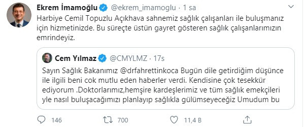 Sağlık Bakanı Fahrettin Koca'nın olumlu yanıt verdiği Cem Yılmaz'a bir çağrı da İstanbul Büyükşehir Belediye Başkanı Ekrem İmamoğlu'ndan geldi. Belediye Başkanı Ekrem İmamoğlu, Cem Yılmaz'ın tweet'ini alıntılayarak “Harbiye Cemil Topuzlu Açıkhava sahnemiz sağlık çalışanları ile buluşmanız için hizmetinizde. Bu süreçte üstün gayret gösteren sağlık çalışanlarımızın emrindeyiz" mesajını yayınladı. Cem Yılmaz hayranları şimdi hangi kuruluşun ünlü komedyene çağrı da bulunacağını merak ediyor. Konu ile ilgili gelişmeleri takipçilerimizle paylaşamaya devam edeceğiz.