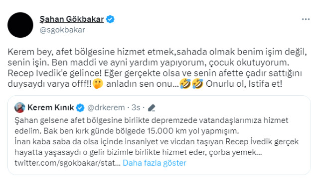 Gökpınar bu mesajı da cevapsız bırakmayarak “Kerem bey, afet bölgesine hizmet etmek, sahada olmak benim işim değil, senin işin. Ben maddi ve ayni yardım yapıyorum, çocuk okutuyorum. Recep İvedik'e gelince! Eğer gerçekte olsa ve senin afette çadır sattığını duysaydı varya offf!!Anladın sen onu... Onurlu ol, istifa et!" çağrısında bulundu.