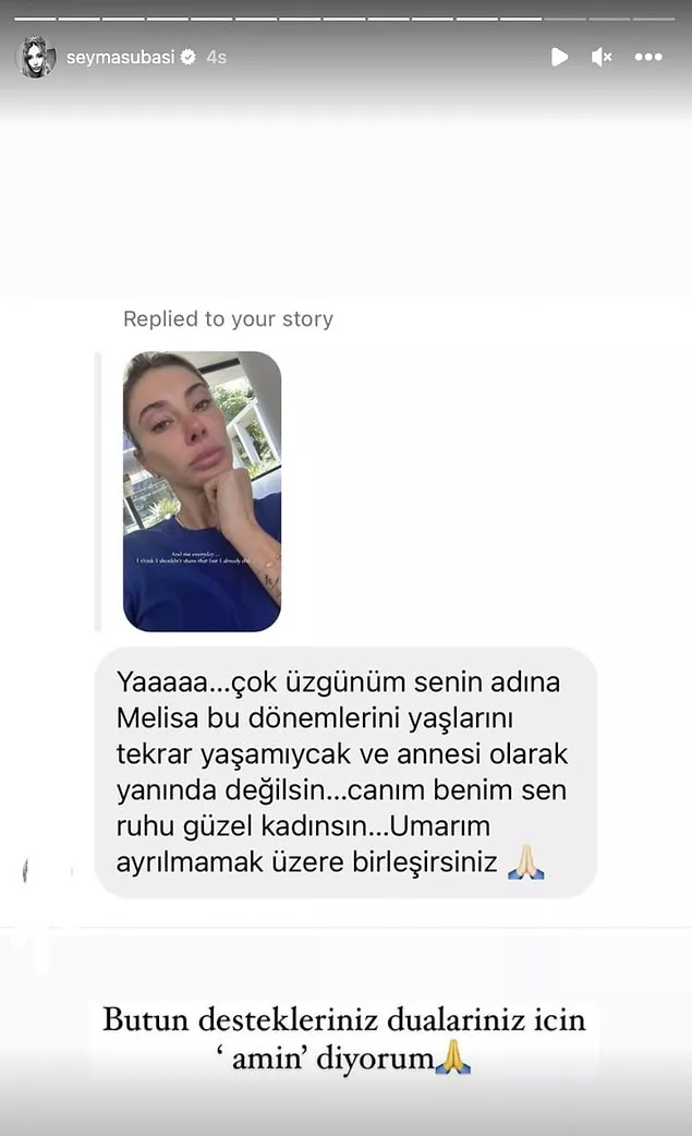 Her şey Acun Ilıcalı’nın kızı Melisa ile poz vermesiyle başladı. Bu poz sonrası Şeyma Subaşı'nın kızından ayrı yaşadığı ortaya çıktı. Dikkatli bir takipçi Melisa ile annesinin ayrı olmasından dolayı duyduğu üzüntüyü Şeyma Subaşı ile paylaştı. Şeyma Subaşı’nın takipçisine verdiği cevap iddiaların gerçekliğini artırdı. Şeyma Subaşı hayranından şöyle bir paylaşım aldı: "Çok üzgünüm senin adına Melisa bu dönemlerini yaşlarını tekrar yaşamayacak ve annesi olarak yanında değilsin. Canım benim ruhu güzel kadınsın. Umarım ayrılmamak üzere birleşirsiniz"