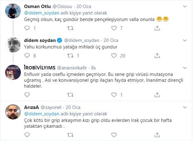 Hastalık mesajını paylaştıktan sonra birçok yorum yapılan Soydan hastalığının şiddetini ise şu sözlerle anlattı; "Yahu korkuncmus yatağa mihladi üç gundur." Soydan'a gelen yorumlardan da anaşılacağı üzere birçok insan aynı hastalıkla pençeleşiyor. Son günlerde toplumun her kesiminde farklı türleri görülen grip vakaları oldukça arttı. Çok fazla insanın gribe yakalanması birçok eczanede ilaç sıkıntısına da yol açıyor. Hastanelerdeki yoğunluk ise işin diğer bir boyutu. Hekese canlitv.com olarak geçmiş olsun dileklerimizi iletiyoruz.