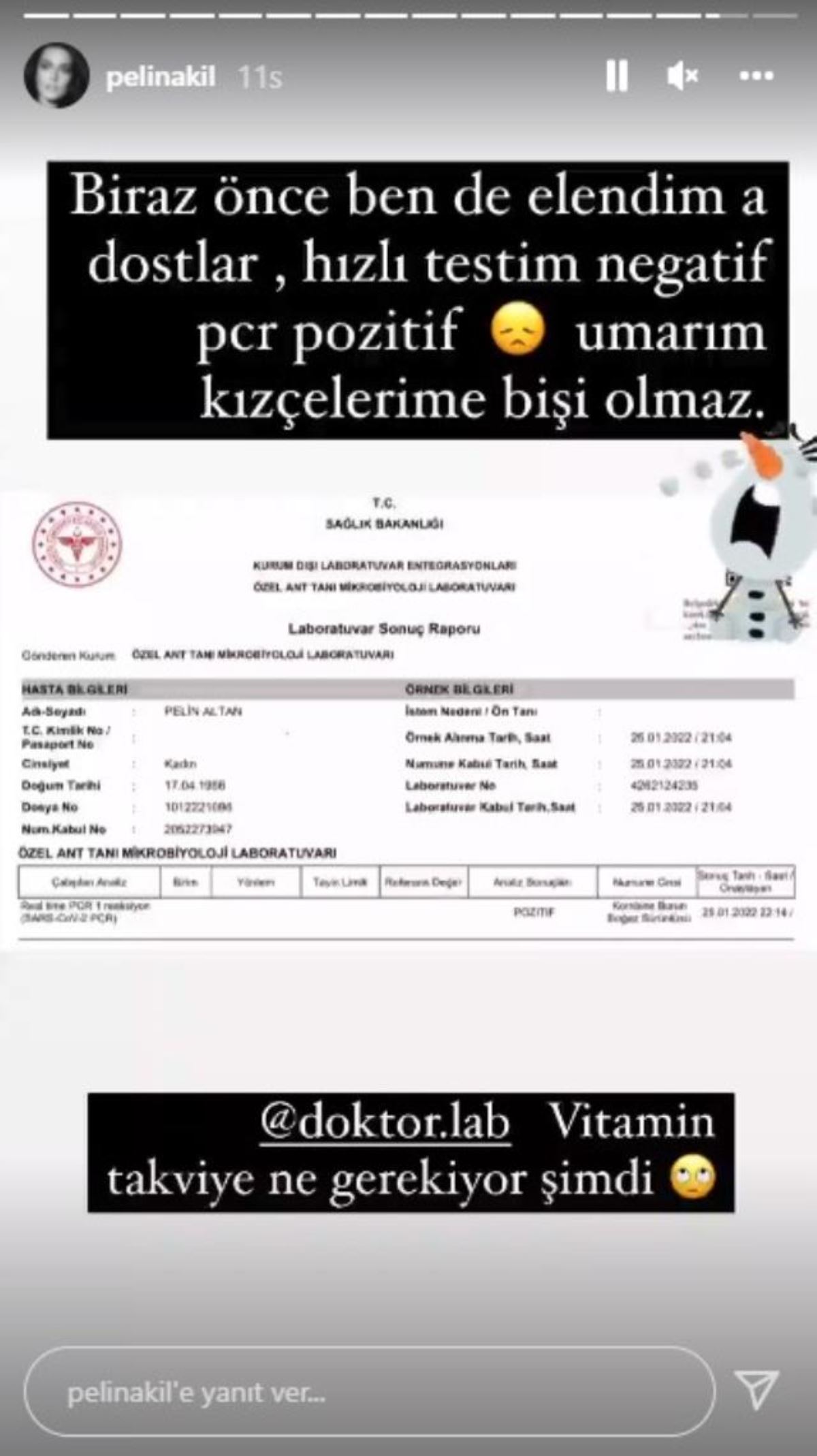 TRT1'in ve Türk televizyonlarının ilk deniz dizisi olma unvanını kazanan Barbaroslar Akdeniz’in Kılıcı dizisinde Isabel rolünü başarıyla canlandıran Pelin Akil, faranjite yakalandı. Çılgınların yaptığı bir paylaşımdan etkilenerek mayosunu giyen ve soğuk havaya aldırış etmeden önce kendisini karın içine bırakan Pelin Akil, sosyal medyadan paylaşım yapmıştı. Karın içinde yuvarlanışı "Ya akım ya zatürre" notuyla paylaşan oyuncunun korktuğu başına geldi. Paylaşımından birkaç saat sonra rahatsızlanan oyuncu soluğu hastanede aldı. "Challenge or zatürre yarışmasında zatürre kazandı. Zatürre olmasam da yine faranjit" diyerek hayranlarına bilgi veren güzel oyuncu gece yarısı apar topar hastaneye giderek test yaptırdı. Bugün de koronaya yakalandığını duyuran oyuncu, sağlık durumunu endişeyle izleyen sevenlerine "Biraz önce ben de elendim a dostlar. Hızlı testim negatif, PCR testim pozitif” diyerek bilgi verdi.