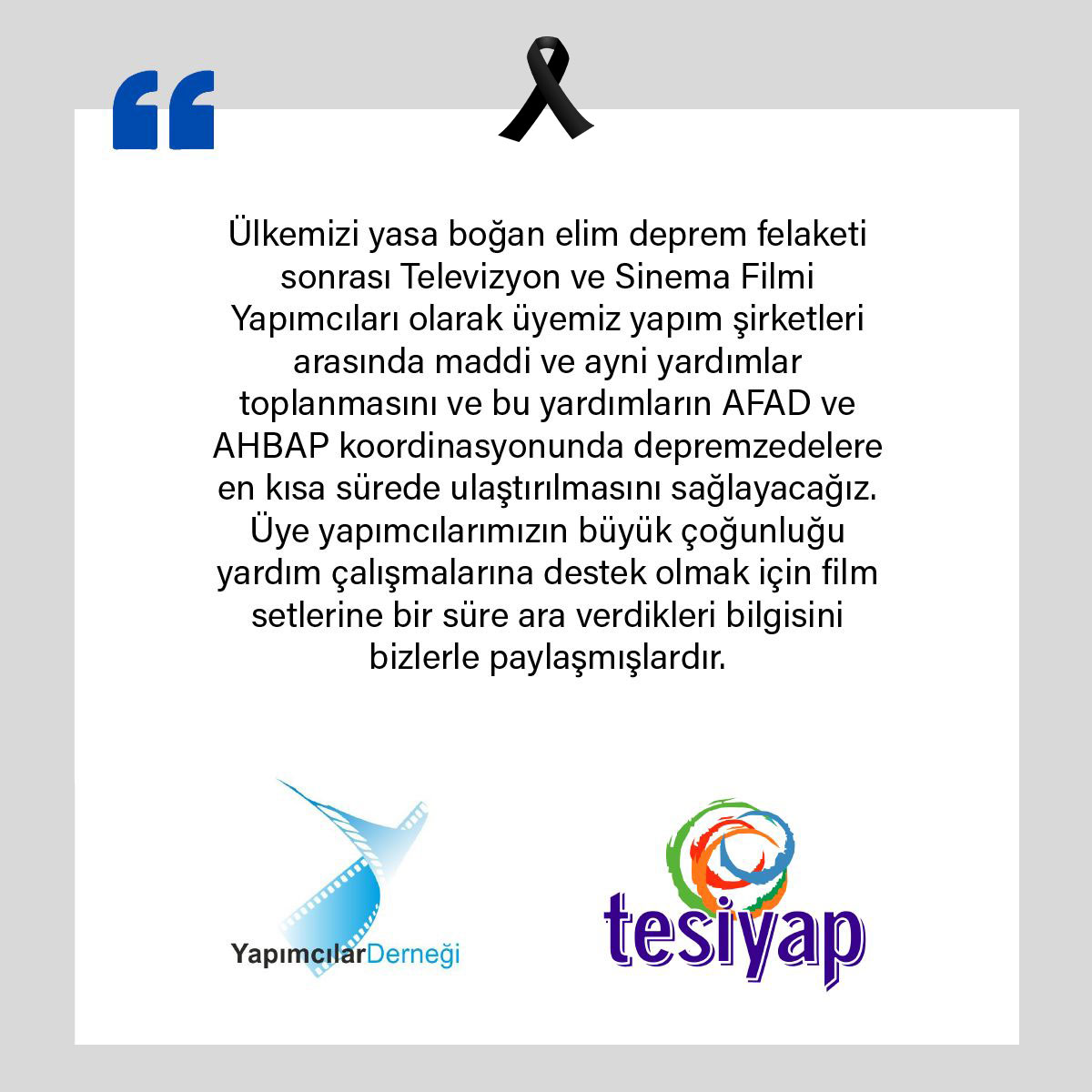 Devlet tarafından 7 günlük milli yas ilan edilirken dizi setlerine ara verildi. İstisnasız tüm kanallar yayın akışlarında değişiklik yaptı ve bir hafta boyunca dizi ve program yayınlamama kararı aldı. Bununla birlikte tüm Türkiye deprem bölgesine destek amacıyla faaliyetlere başladı. Bu konuda ilk olarak Ay Yapım adım attı ve deprem bölgesine malzeme yardımı yaptı. Birsen Altuntaş’ın yazdığı habere göre Televizyon ve Sinema Filmi Yapımcıları Meslek Birliği Başkanı Timur Savcı televizyon sektörüne seslenerek sosyal medya hesabından bir paylaşım yaptı.İşte o paylaşım