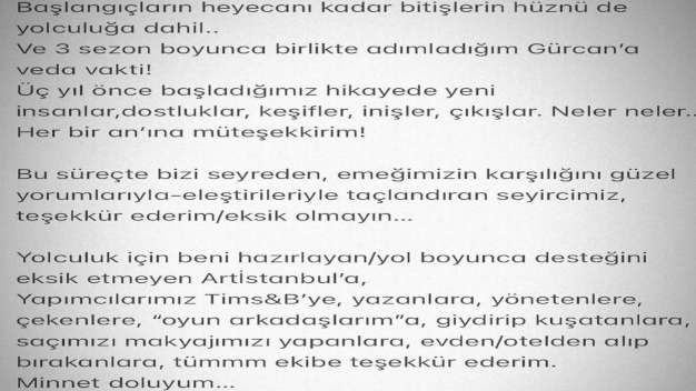 Tims & B Yapım tarafından hazırlanan ve TRT 1 ekranlarının en çok seyredilen dizilerinden olan ve 4. Sezon için hazırlıklarını sürdüren başarılı dizilerden Teşkilat’ın kadrosundan bir oyuncu daha ayrıldı. Dizinin hikayesinde Gürcan karakterine hayat veren Ahmet Uğur Say dizinin hikayesine veda etti. Ahmet Uğur Say veda paylaşımında “başlangıçların heyecanı kadar bitişlerin hüznü de yolculuğa dahil. Ve üç sezon boyunca birlikte adımladığım Gürcan’a veda vakti. Üç yıl önce başladığımız hikayede yeni insanlar, dostluklar, keşifler, inişler, çıkışlar. Neler neler… Her bir anına müteşekkirim. Bu süreçte bizi seyreden emeğimizin karşılığını güzel yorumlarıyla eleştirileriyle taçlandıran seyircimiz teşekkür ederim eksik olmayın. Yolculuk için beni hazırlayan yol boyunca desteğini eksik etmeyen Art İstanbul’a, Yapımcılarımız Tims&B’ye yazarlara yönetmenlere çekenlere oyun arkadaşlarıma giydirip kuşatanlara saçımızı makyajımızı yapanlara evden otelden alıp bırakanlara, tüm ekibe teşekkür ederim. Minnet doluyum. İyi ki Teşkilat beni buldu” ifadelerini kullandı.