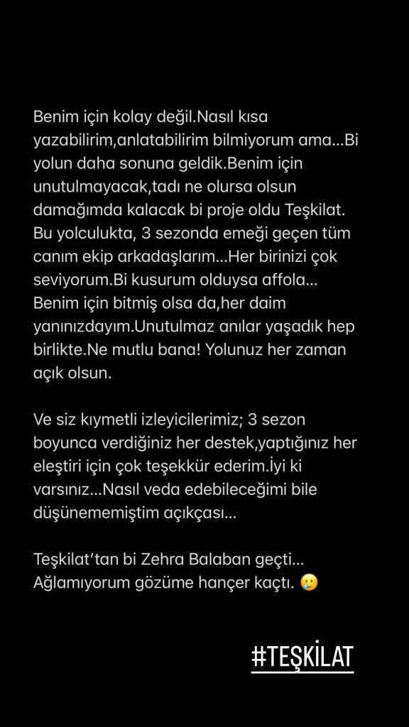 Oyuncu Deniz Baysal Yurtçu Teşkilat’tan ayrılırken sosyal medya hesabından duygusal bir veda mesajı yayınladı. Oyuncu paylaşımında “benim için kolay değil. Nasıl kısa yazabilirim anlatabilirim bilmiyorum ama bir yolun daha sonuna geldik. Benim için unutulmayacak, tadı ne olursa olsun damağımda kalacak bir proje oldu Teşkilat. Bu yolculukta 3 sezonda emeği geçen tüm canım ekip arkadaşlarım her birinizi çok seviyorum. Bir kusurum olduysa affola. Benim için bitmiş olsa da her daim yanınızdayım. Unutulmaz anılar yaşadık hep birlikte. Ne mutlu bana yolunu her zaman açık olsun. Ve siz kıymetli izleyicilerimiz... 3 Sezon boyunca verdiğiniz her destek, yaptığınız her eleştiri için teşekkür ederim. Iyi ki varsınız. Nasıl veda edebileceğimi bile düşünmemiştim açıkçası. Teşkilat’tan bir Zehra Balaban geçti. Ağlamıyorum gözüme hançer kaçtı” ifadelerini kullandı.