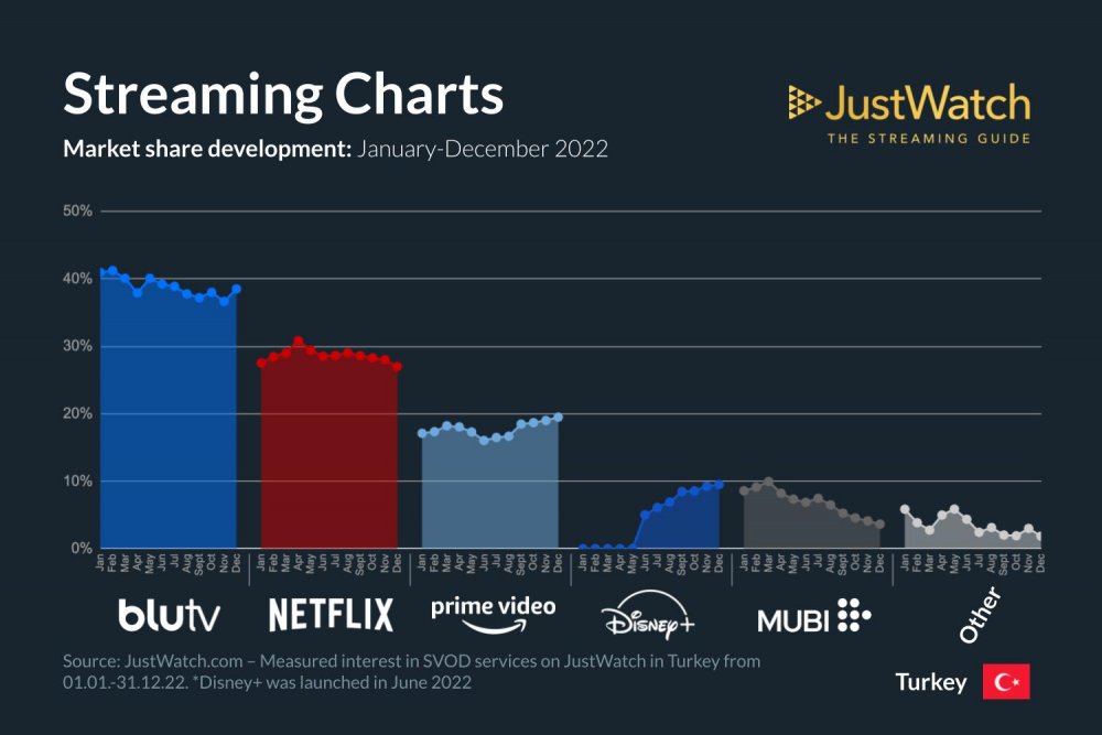 Henüz ilk senesinde olmasına rağmen Disney+, Türkiye pazarında yükselen bir yıldız olmayı başardı. BluTv’den sonra en başarılı platform olan Disney+, haziran ayında yaptığı lansmandan bu yana rakiplerine fark attı ve yılı pazarın % 10'unu kazanarak kapattı. Prime Video, ocak ayından bu yana % 3 artı ve bu artışla 2022'de pazar payı kazanan diğer tek büyük oyuncu oldu. Bu kazanımlar Blutv, Netflix ve Mubi üzerinde de etkili oldu.