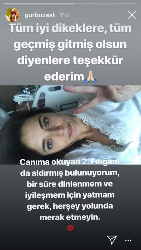 Aslıhan Gürbüz'ü merak eden takipçileri sosyal medyadan paylaşımların altına yorum yaparak ve mesaj atarak durumunu öğrenmeye çalıştı. Gürbüz, sevenlerinin merakını dindirmek için hastaneden paylaştığı fotoğrafa "Tüm iyi dileklere, tüm geçmiş gitmiş olsun diyenlere teşekkür ederim. Canıma okuyan 2. fıtığımı da aldırmış bulunuyorum. Bir süre dinlenmem ve iyileşmem için yatmam gerek, herşey yolunda. Merak etmeyin." yazdı.