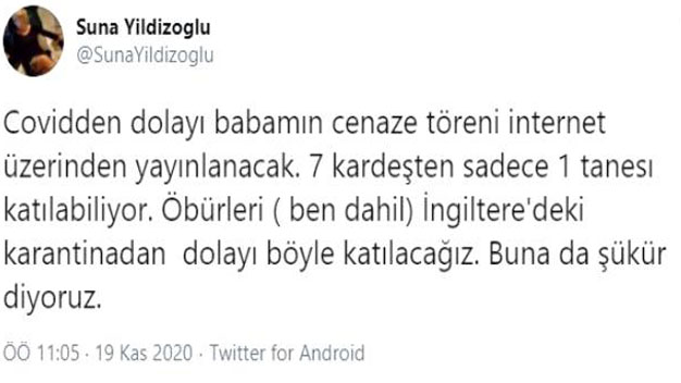 Türk Sinema, tiyatro ve dizi dünyasının önde gelen başarılı oyuncularından suna Yıldızoğlu üç gün önce İngiltere’de yaşayan babası Patrick William’ı kaybetmişti. Ünlü isim babasının hayatını kaybettiği haberini sosyal medya üzerinden sevenleriyle paylaşmış ve “Babam… Bugün çok keyifliymiş… Sonra biraz evvel uykusunda bizden ayrıldı” ifadeleriyle babasının hayatını kaybettiğini duyurmuştu. Bu acı olay üzerine sanatçıya pek çok seveni ve yakını taziyelerini bildirmişlerdi. Bugün ise ünlü isim yine bir paylaşımda bulunarak babasının cenazesine internet üzerinden katılacağını duyurdu. Yıldızoğlu paylaşımında “Covidden dolayı babamın cenaze töreni internet üzerinden yayınlanacak. 7 kardeşten sadece 1 tanesi katılabiliyor. Öbürleri (ben dahil) İngiltere’deki karantinadan dolayı böyle katılacağız. Buna da şükür diyoruz” ifadelerini kullandı. Sanatçı ayrıca taziyelerini bildiren takipçilerine ve sevenlerine teşekkür ederek iyi ki varsınız dedi.