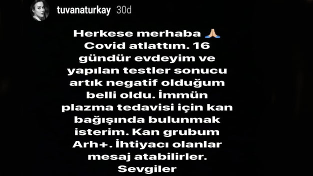 3 Ekim 1990 yılında İstanbul’da dünyaya gelen güzel oyuncu Tuana Türkay koronavirüsü yendiğini sevenleriyle sosyal medya hesabından yaptı bir paylaşımla duyurdu. Güzel oyuncu paylaşımında “Herkese merhaba coronayı atlattım. 16 gündür evdeyim ve yapılan testler sonucu artık negatif olduğum belli oldu. İmmün plazma tedavisi için kan bağışında bulunmak isterim. Kan grubum A RH + ihtiyacı olanlar mesaj atabilirler” ifadelerini kullandı. Durumunun iyi olduğu bildirilen güzel oyuncuya geçmiş olsun dileklerimizi iletiyor ve bu duyarlı davranışından dolayı kendisini tebrik ediyoruz.
