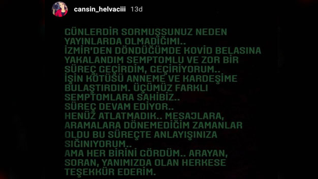 A Haber Sunucusu Cansın Helvacı koronavirüse yakalandığını sosyal medya hesabından yaptığı bir paylaşımla duyurdu. İzmir depremindeki yayınların ardından bir süredir ekranda görünmeyen sunucu bunun sebebini hastalığa bağladı. Cansın Helvacı sosyal medya hesabından yaptığı paylaşımında “günlerdir sormuşsunuz neden yayınlarda olmadığımı… İzmir’den döndüğümde covid – 19 belasına yakalandım. Semptomlu ve zor bir süreç geçirdim, geçiriyorum. İşin kötüsü anneme ve kardeşime bulaştırdım. Üçümüz farklı semptomlara sahibiz. Süreç devam ediyor. Henüz atlatamadık. Mesajlara, aramalara dönemediğim zamanlar oldu bu süreçte anlayışınıza sığınıyorum. Ama her birini gördüm. Arayan, soran yanımızda olan herkese teşekkür ederim” ifadelerini kullandı. Bizde güzel ve başarılı sunucuya ve ailesine geçmiş olsun dileklerimizi iletiyor biran önce sağlıklarına kavuşmalarını temenni ediyoruz.