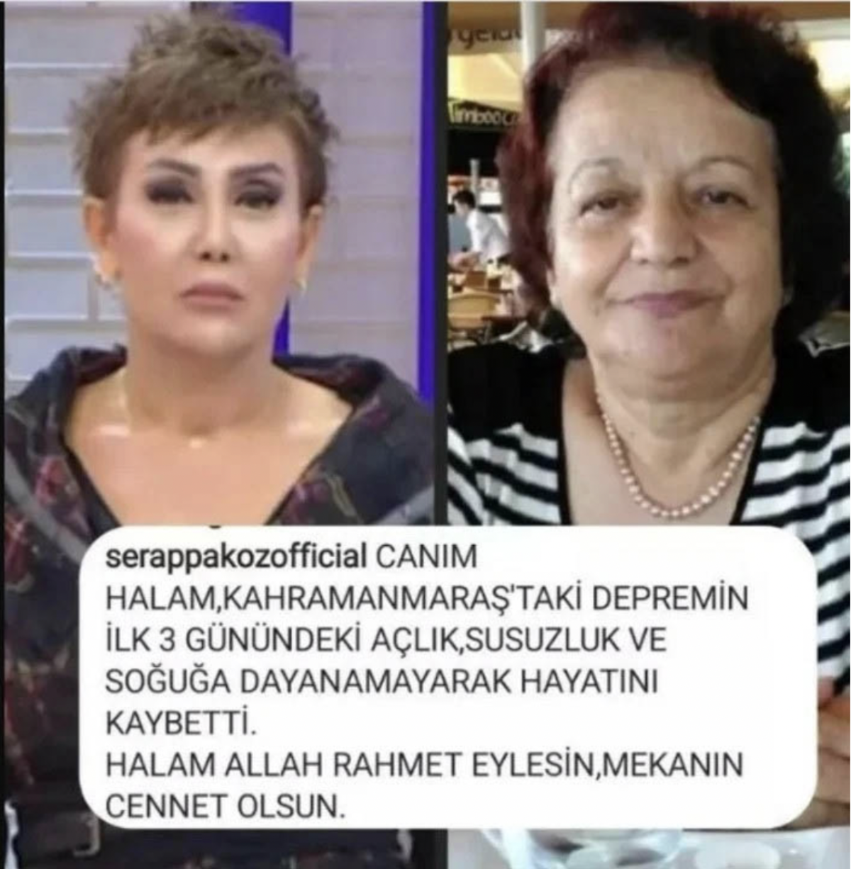 Kahramanmaraş merkezli 0n ilde yaşanan yıkıcı iki deprem sonrası binlerce insan hayatını kaybederken binlerce insan yaralandı ve on binlerce insan ise evsiz barksız kalarak çadırlarda konteynırlarda yaşamını sürdürmeye başladı. Yaşanan iki büyük depremin ardından pek çok ünlü isim de enkaz altında kalırken bu isimlerden özellikle oyuncu Melek Atıcı dikkatleri çekti. Pek çok ünlü ismin de yakınlarını kaybettiği ve kaybettiklerinin kurtulması için bütün çabalarını harcadılar ancak ne yazık ki bu bazen gerçekleşmedi ve ünlü isimlerin yakınları da depremde enkaz altında kalarak hayata veda eden isimler arasında yer aldı. Pek çok ünlü ismin yakınının hayatını kaybettiği deprem bölgesinde yakınını kaybeden son ünlü isim ise ünlü ve başarılı sunucu Serap Paköz oldu. Ünlü sunucu sosyal medya hesabından yaptığı paylaşımda halasını kaybettiğini duyurdu.